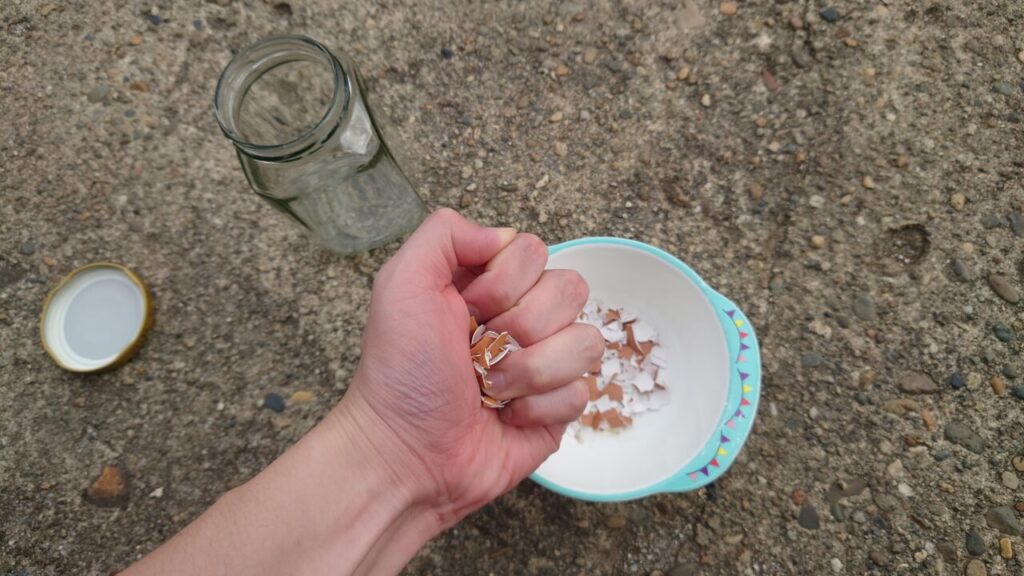 次に卵の殻が溶けやすいよう細かく砕きます。(/・ω・)/ヤー、ハッ!