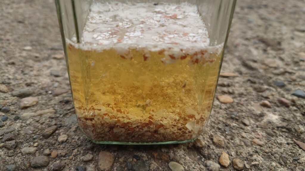 卵の殻でダメージを受けましたが、砕いた殻を適当な容器に入れ酢を投入します。ちなみに、卵の殻を砕く時は手袋をした方がいい。( ̄▽ ̄)前回記事でも同じ事やってたね