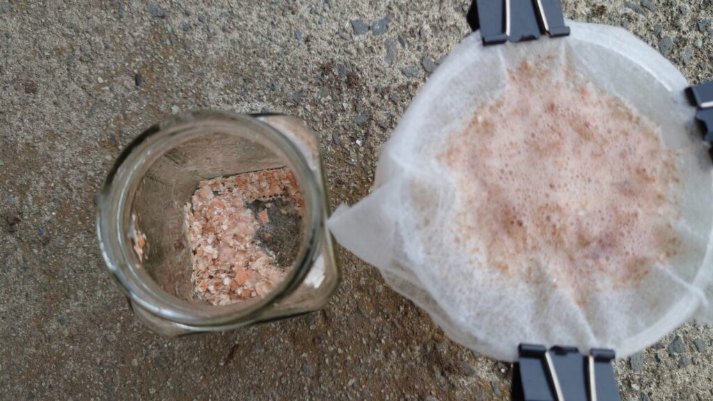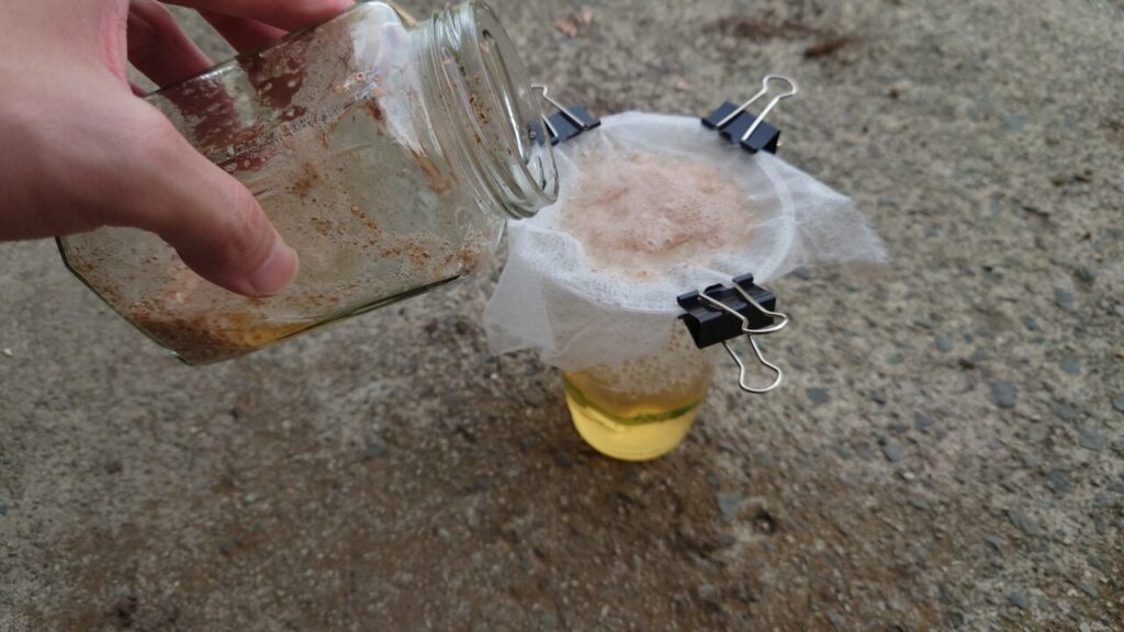 2時間後、反応が弱くなったので濾していきます。コーヒーのドリップ紙を家に取り行くのが面倒だったので、その辺にあった園芸用の不織布を引き千切って使用。(`・ω・´)ワイルドだろう~