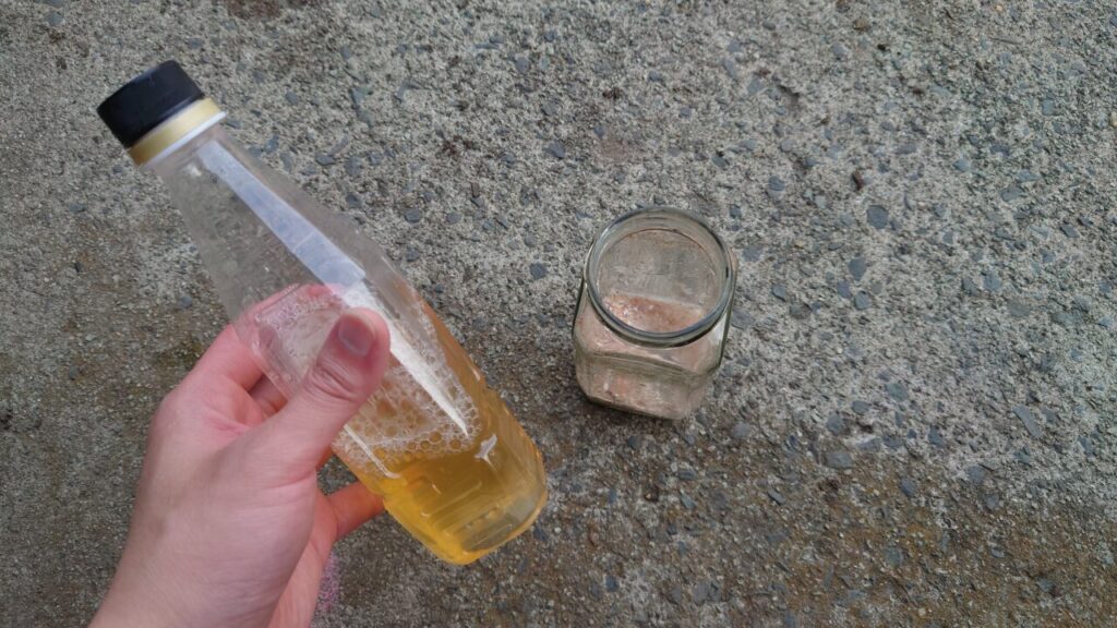 あとは、濾した溶液をペットボトルに詰めてカルシウム酢(酢酸カルシウム)の完成。