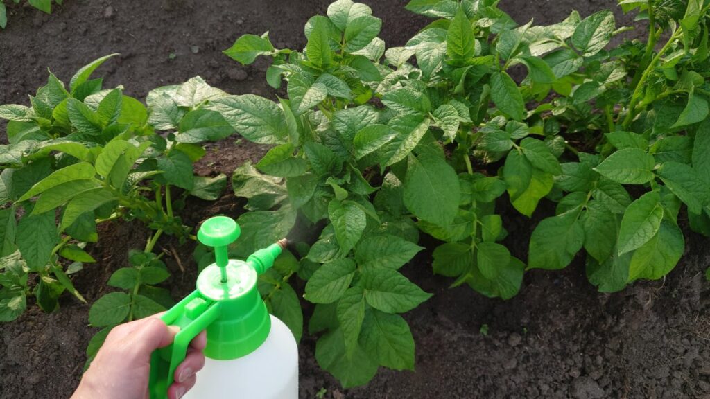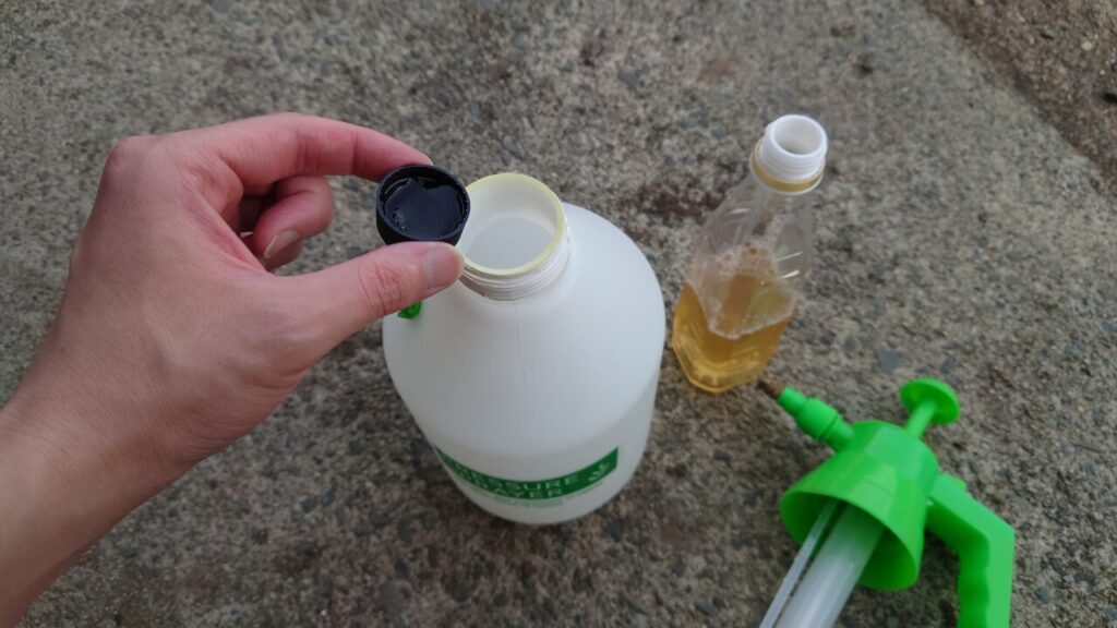 ちょうどこの頃、ジャガイモ『きたかむい』を植えていたので試しに噴霧してみる事にしました。容量が1.5ℓの噴霧器にカルシウム酢をペットボトルキャップ1杯(約7㎖)を投入!(/・ω・)/正確に測るのは面倒だぜ