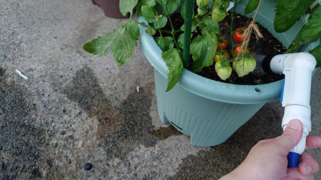 この溜まっている水は暖かく長時間放置すると良くなさそうなので、上記で説明した水やり方法でミニトマト栽培を行った感じです。(´・ω・`)梅雨の季節じゃないから別に問題ないのかな?