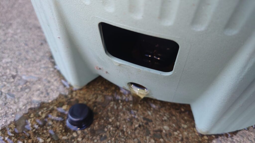 ドレンプラグから新しい水が出てくるまで掛けたらドレンプラグを付けて、オーバーフローの穴(ドレンプラグの上にある穴)からあふれるまで水を上げます。これなら古い水は残らないでしょう。(;^ω^)多分ね