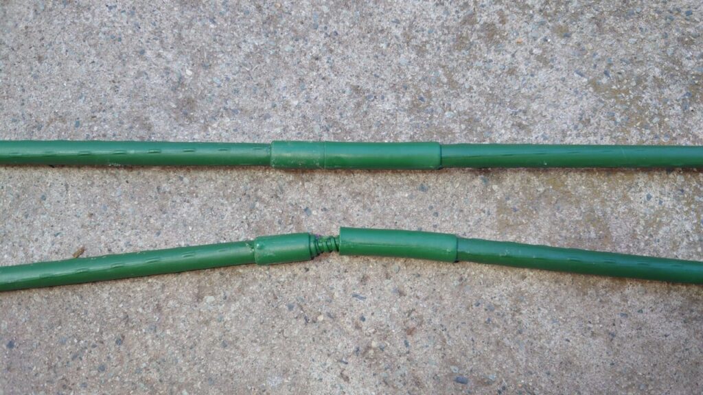 でも、この使い方をすると連結の受け側(雌ネジ側)を地中に挿す事になるので、連結部の穴に土が入らないようにテープで塞いだ方がいいですね。あと、ジョイントも3本しか使用できないので強度が不安なのとこれ以上の連結は厳しいかも。( ̄д ̄)紐で縛ればイケるか?