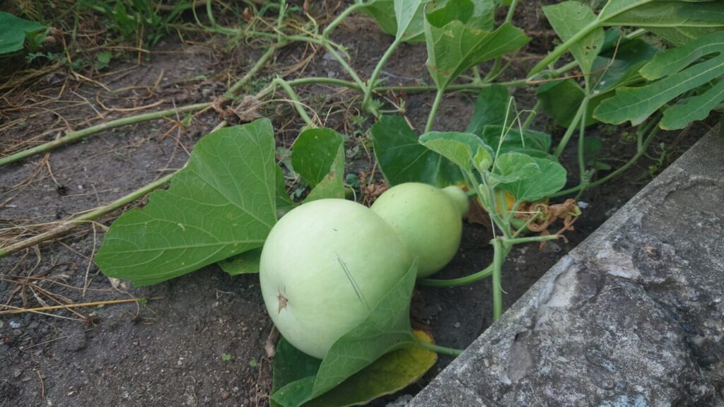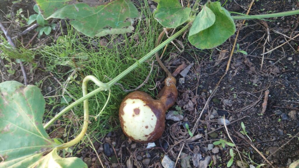 2025年もたい肥ゾーンから出てきた芽を移植してひょうたんを栽培。たくさん実ると大変なので、2苗だけ植え付けし最終的に5個収穫できました。(`・ω・´)もちろん放置栽培でね