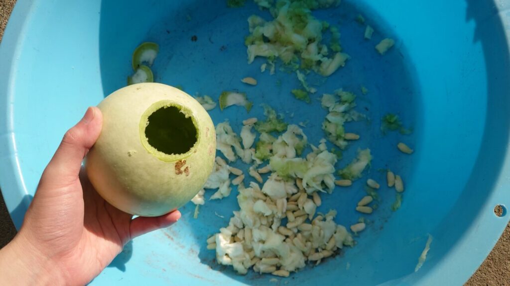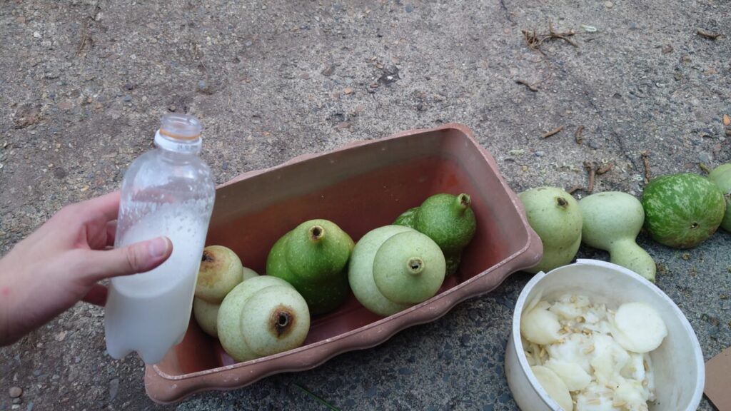 結果、水漬けしたものの方が果肉を取り除く作業が無いので種の回収が楽。しかし、水漬けしたひょうたんは臭いので、嫌な方は水漬けする前に取るのがいいかも。