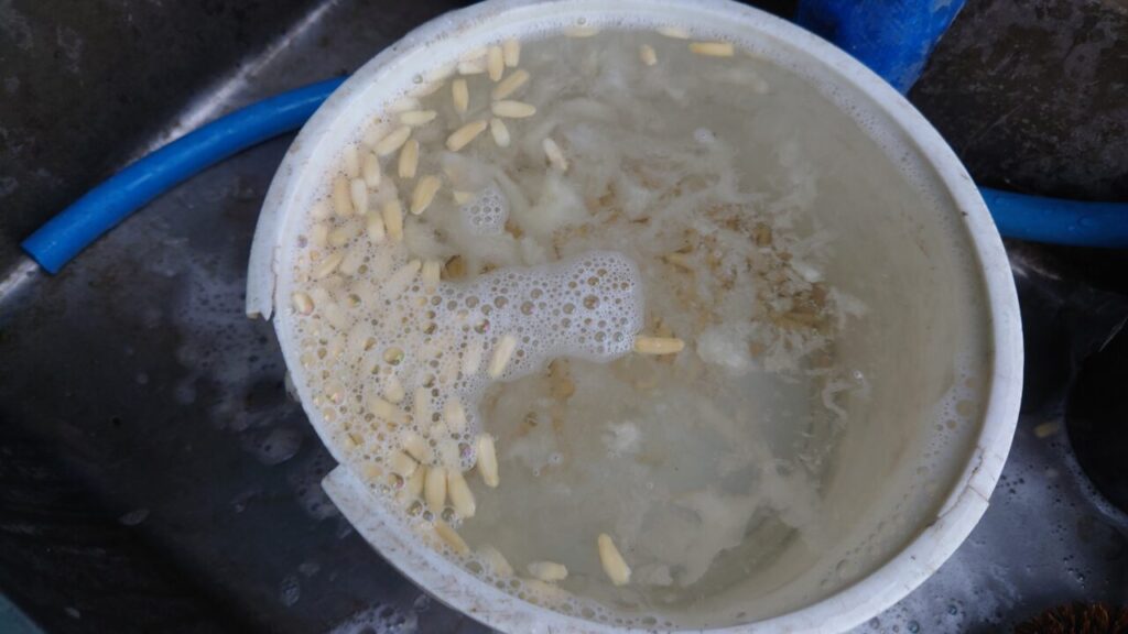 種に果肉が付いているので大まかに取り除きました。そのあと、水に沈めて浮いてきた種は中身が入って無いので取り除きます。(/・ω・)/選別だぁ