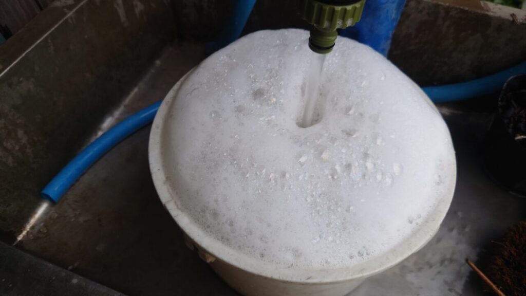 前回の写真で水漬けした時の水が濁っているのは納豆菌を入れたからです。水が濁っていると気づいた方は洞察力ありますね!(納豆菌を培養した記事は後ほど作るかも?)