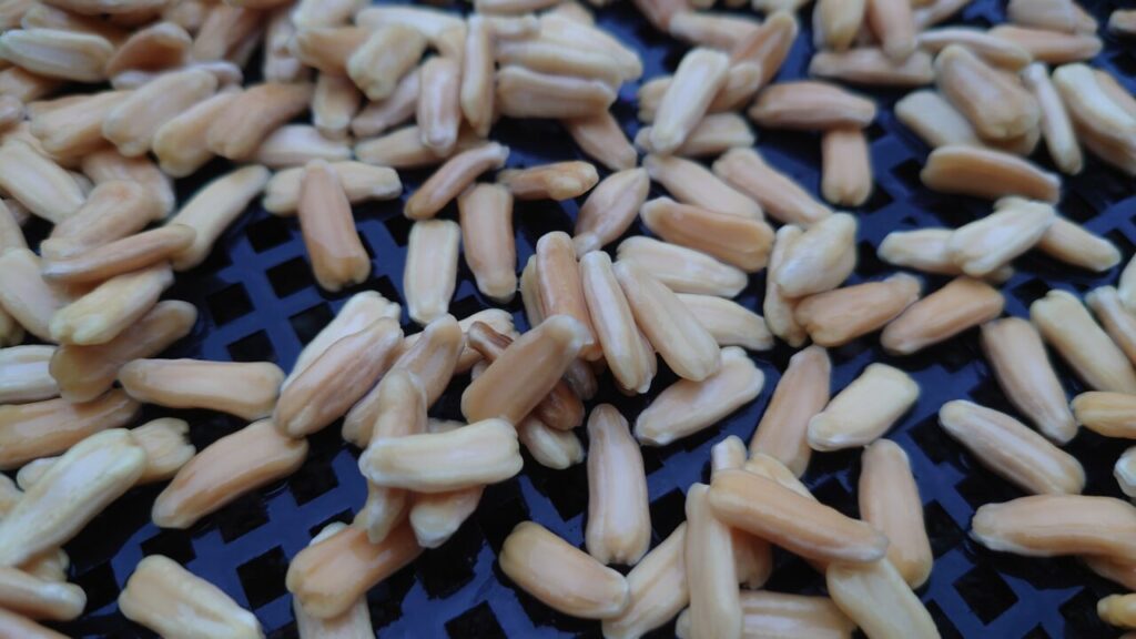 10日後、種が乾燥しました。右側の箱が果肉から取り出した種になります。左の箱は水漬けしたものから取ったもの。水漬けしたものは臭いから種を取らないと言いましたが、試しに中性洗剤でゴジゴシ洗い乾燥させてみると意外と臭くなかったです。(;´∀`)あれれ~