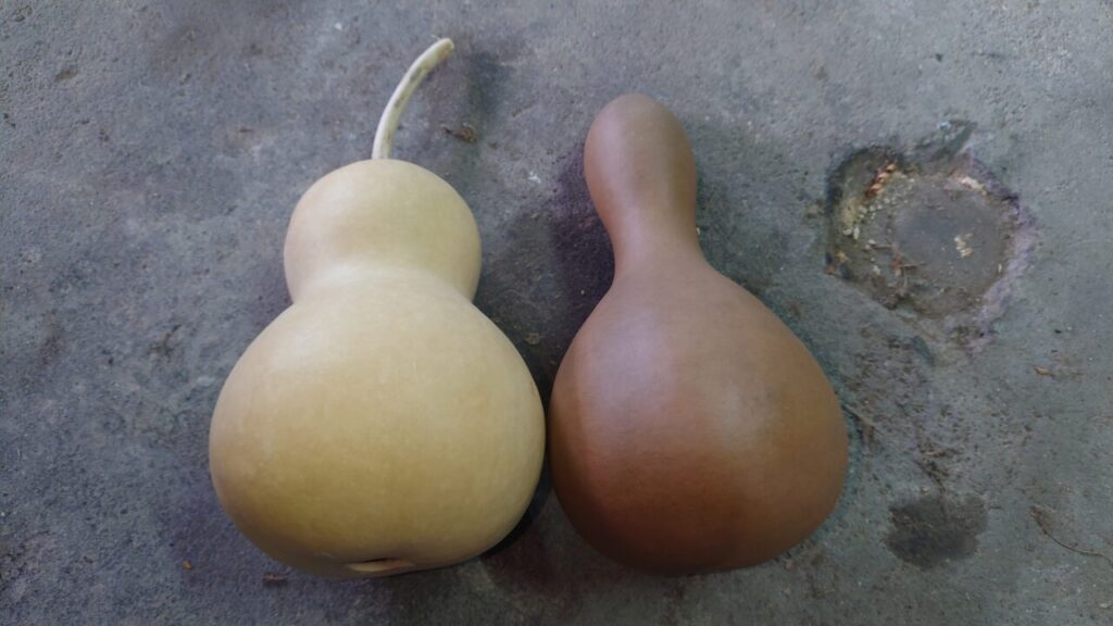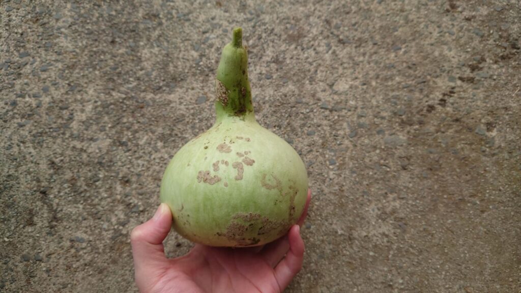それで写真を整理したら、その時のひょうたんを加工したものが出てきました。この写真のひょうたんが唯一実ったものになります。確か、触るとまだ柔らかく未熟の状態だったと思う。( ̄д ̄)虫にもやられた