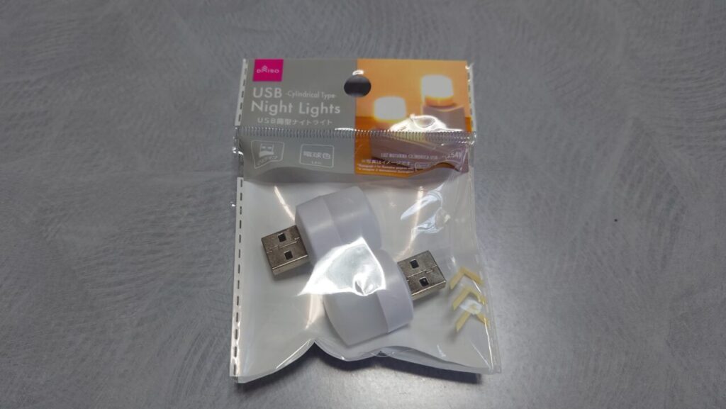こちらがダイソーで購入した『USB筒型ナイトライト』という商品になります。2個入りでお得だったので購入した記憶が残ってる。(調べてみると筒型型と電球型が売っていたようです)