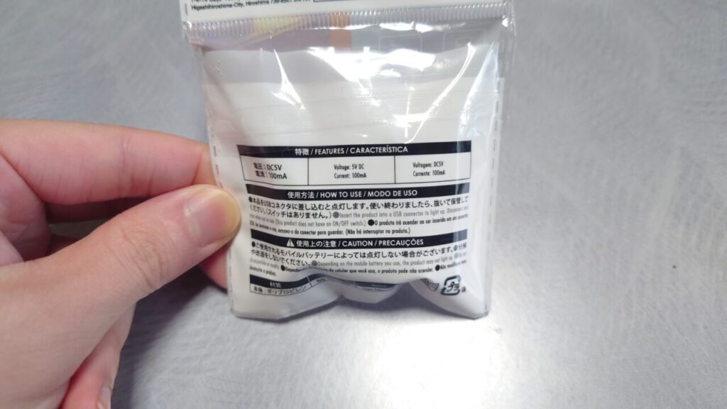 それで気になる消費電力ですが、ダイソーで購入したUSBライトの場合は裏面の説明をみると5Vの100㎃という事なので、電力は0.5Wになるのかな?(;´∀`)計算が苦手なもんで・・・