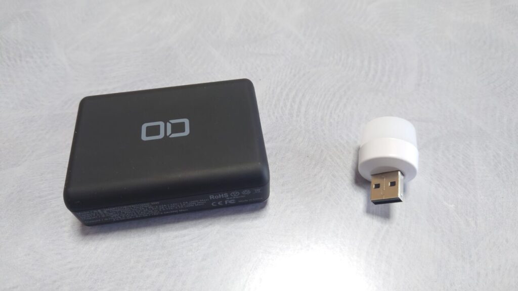 一番問題なのは、真っ暗だとUSBライトをUSBポートに挿せない事かな。明るさを調べる為に照明を消しましたが、USBライトとモバイルバッテリーのポートが見えないので再度照明を付けるというオチ。