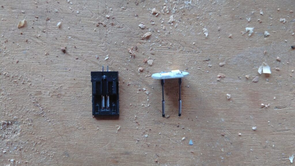 USBのtype-Aは両端の端子がプラスとマイナスなので、基板に繫がっている金属端子2本も両端になってますね。また、黒いプラスチックに残っている2本端子はデータ用なのですが使わないのでダミーのようです。基板にも繋がってない。