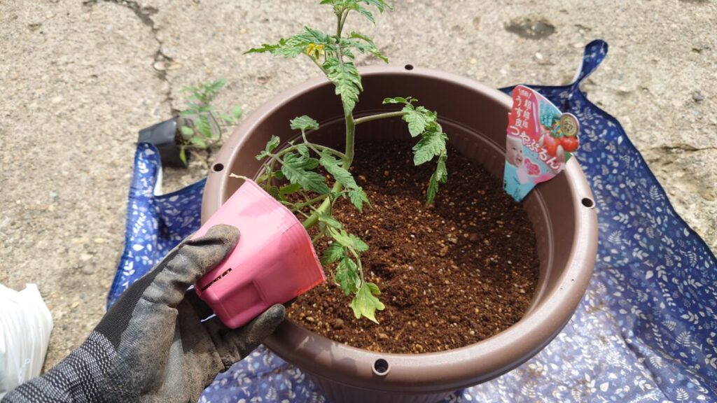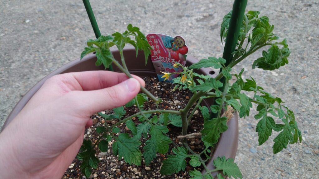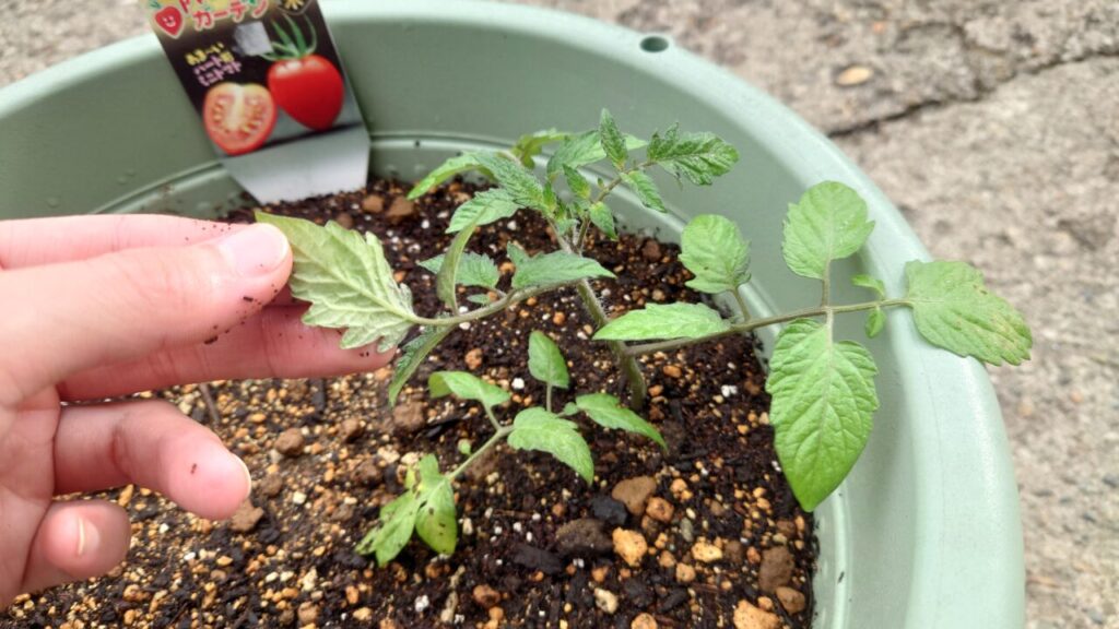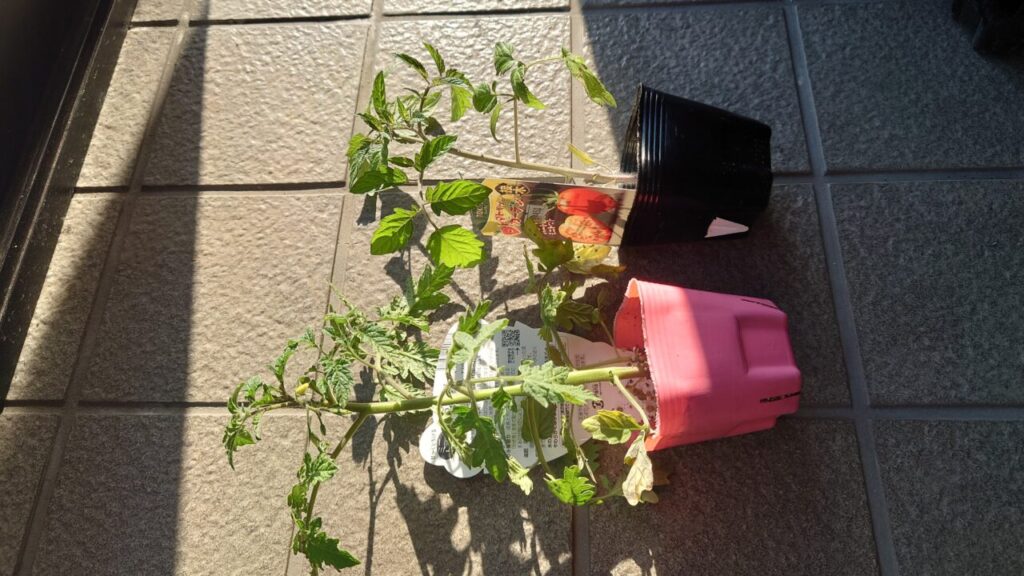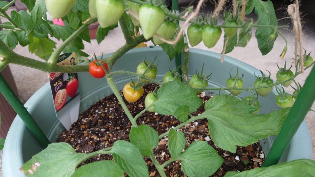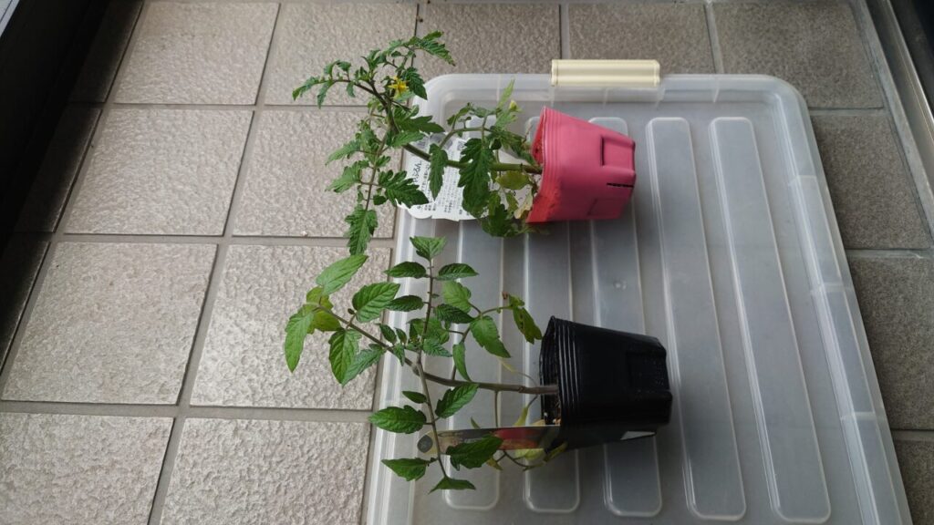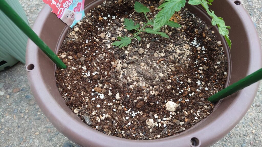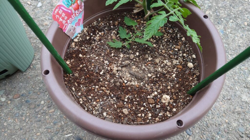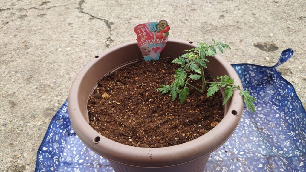 7月上旬。『つやぷるん』のわき芽だったものが成長して立派な苗になりました。なので、こちらを余った小さいプランターに植え付けします。(;^ω^)ちょうどいい大きさのプランターが無かった・・・