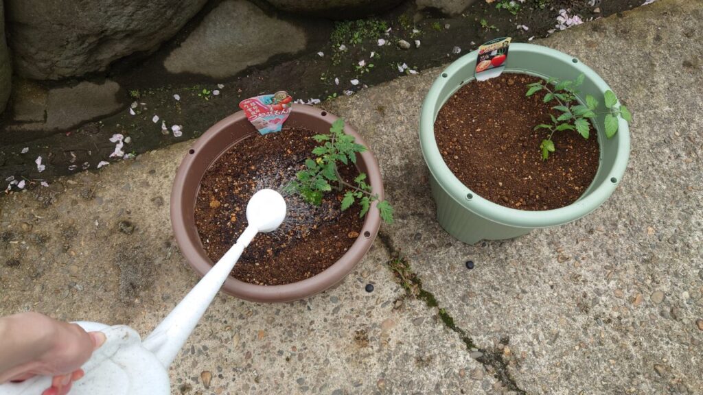 あとは、水を掛けて大きいプランターのミニトマトと一緒に栽培していきます。