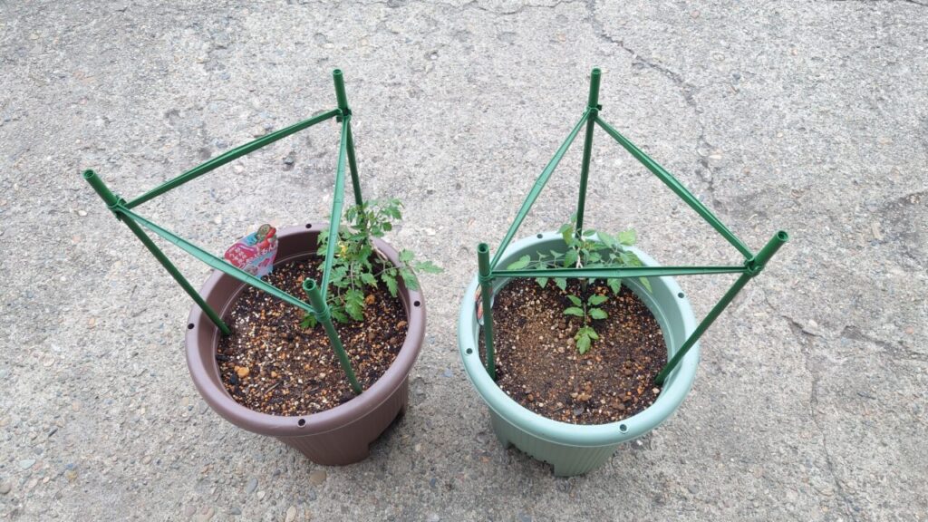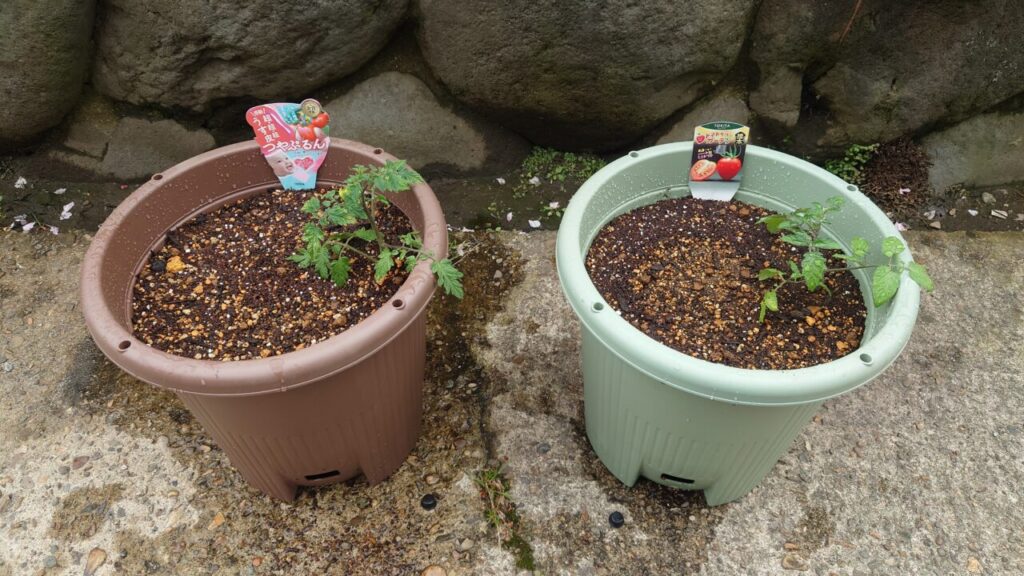 これで植え付けする準備が完了。こうして見るとお辞儀してるみたいでカワイイ。赤色のポットが『つやぷるん』で黒色のポットが『トマトベリー』になります。