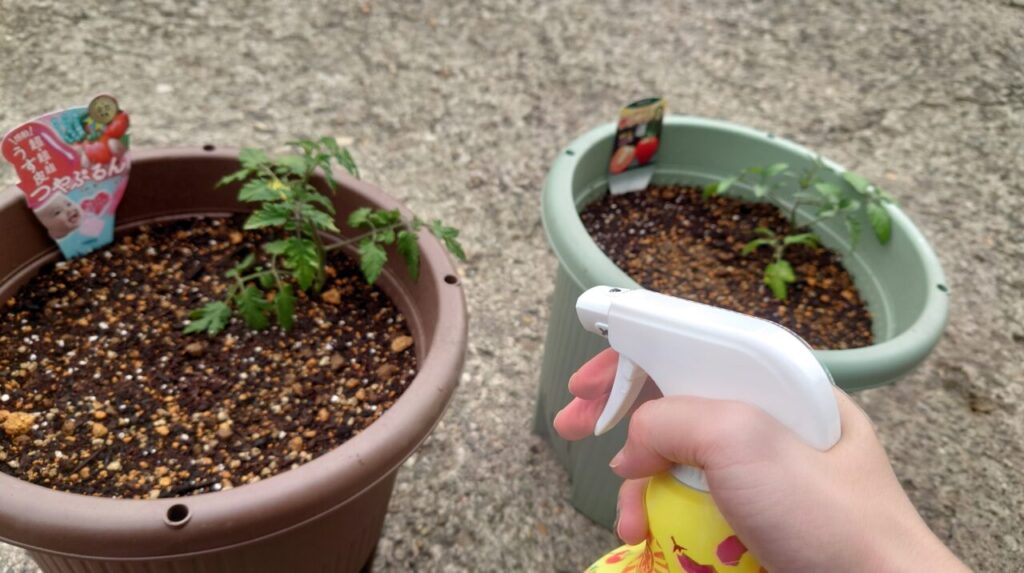 植え付けてすぐですが、さっそく害虫予防に噴霧。(/・ω・)/シュッシュッ!