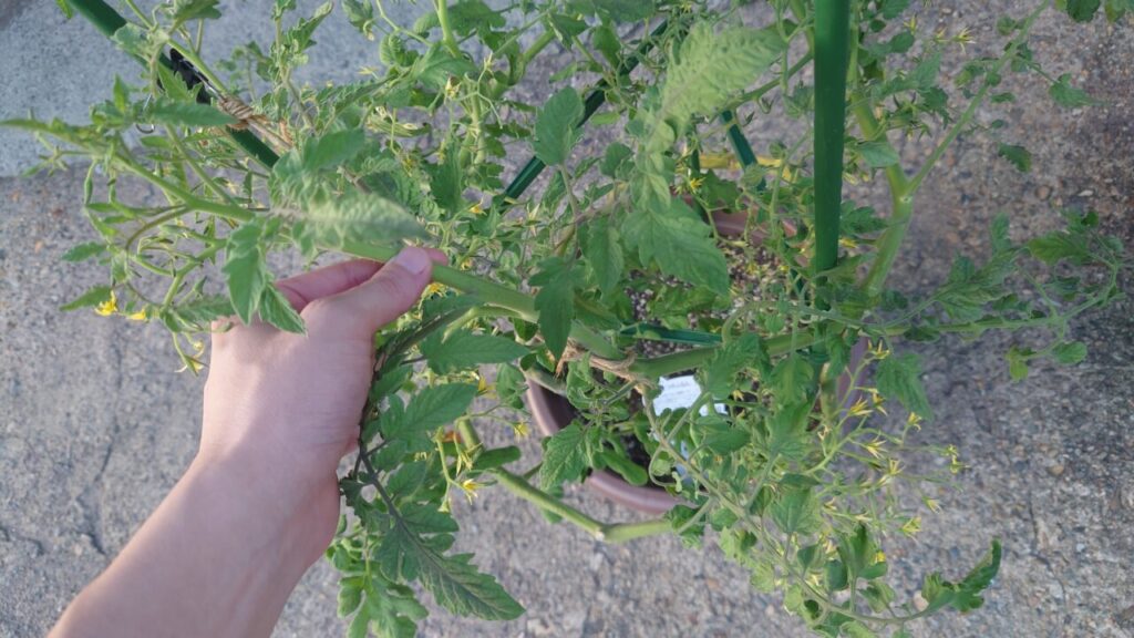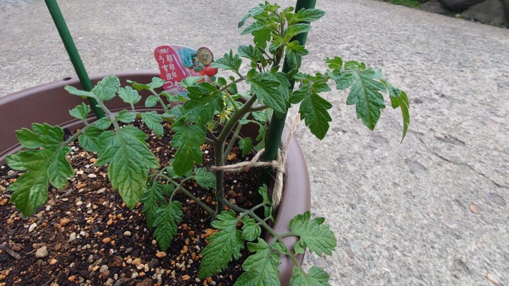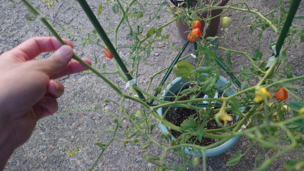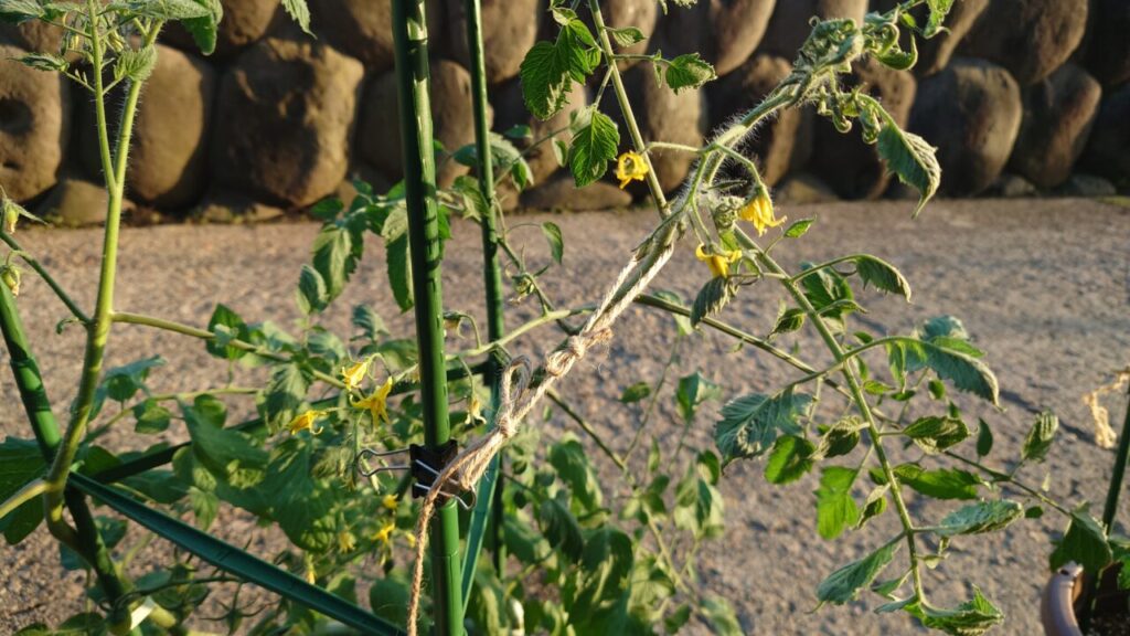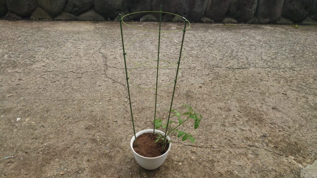 6月下旬。追肥から約1ヶ月経過し、ミニトマトは成長して大きくなりました。なので、支柱を足して巻くように苗を誘引していきます。