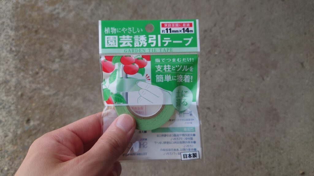 100均の園芸誘引テープで支柱に固定する(5月下旬)
