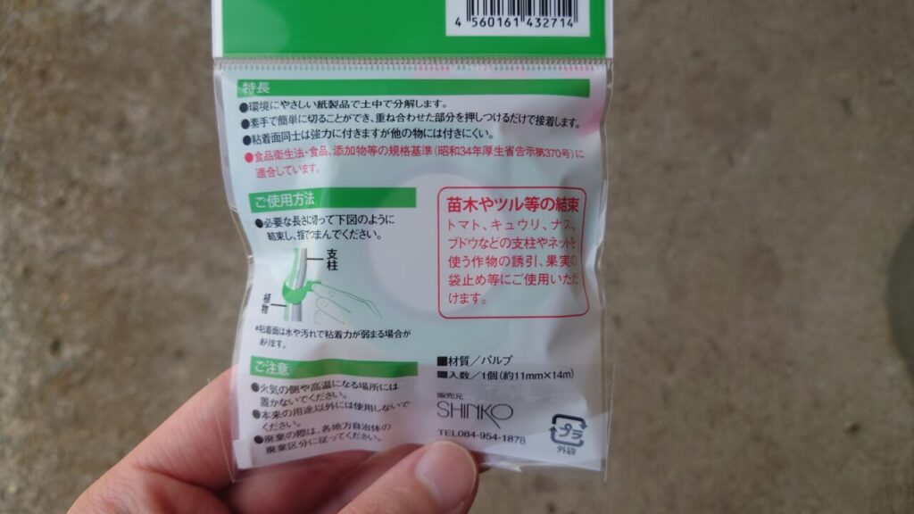 という事で、100均(セリア)で園芸用の針金でも購入しようと買いに行ったら、分解して自然に還る『園芸誘引テープ』というものを発見。( ゚Д゚)私が求めていたのはこれだぁー