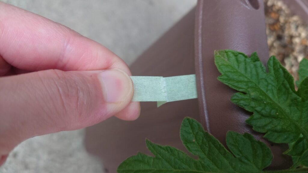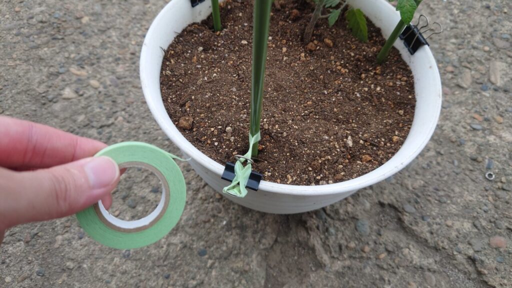 では、茎が太くなる事を考えて空間を開けてテープ同士を接着。テープは手で千切れるので簡単に誘引する事ができます。ハサミなどの道具が必要ないのがいいですね!(/・ω・)/ペタペタ