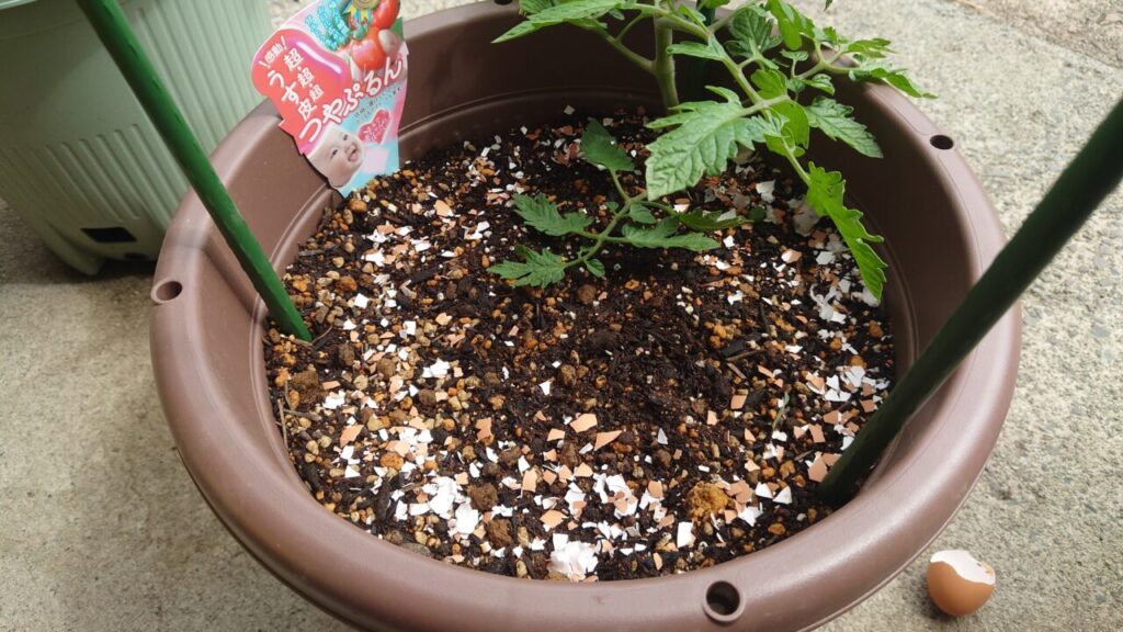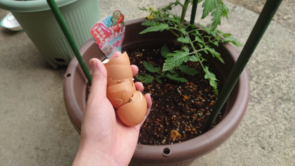 追肥で化成肥料8-8-8を使用しましたが、トマトはカルシウムも無いと尻腐れ病が発症する可能性があると知りました。なので、予防策として卵の殻を投入します!(殻は水でキレイに洗って乾燥させたもの)