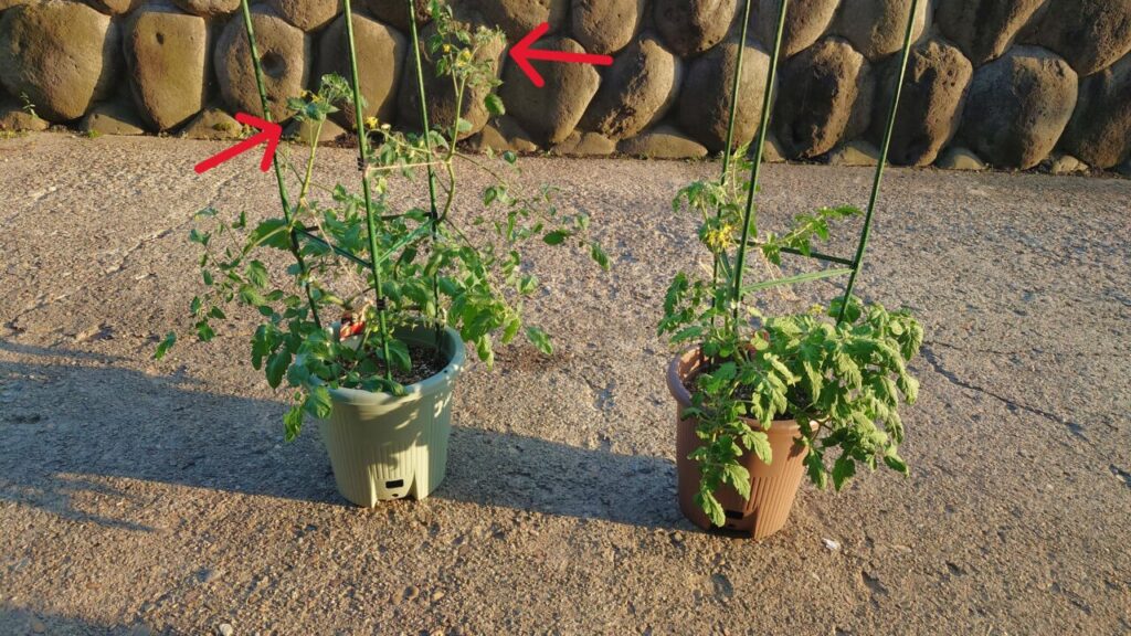 写真左側が『トマトベリー』で2本仕立てで栽培してる方。(赤矢印が苗の各先端)右側が『つやぷるん』で1本仕立て栽培してる方になります。