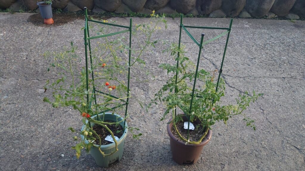 左側の『トマトベリー』はまだ青い実が成っているので猛暑に負けず赤くなって欲しいです。写真右側の『つやぷるん』の方はほぼ収穫したので残ってません。関係ないですが左上に写ってる鉢はレモンユーカリです。(笑)