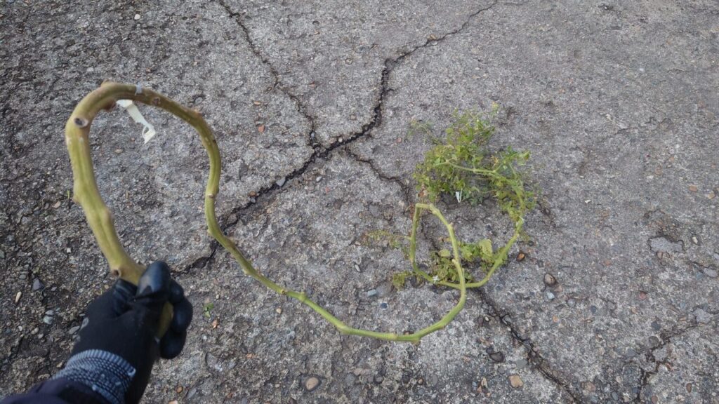 では、支柱を抜いてミニトマトのプランターを片づけていきます。私の場合、畑があるので茎をハサミで小さくカットしたあと埋めて処分する事にしました。100均で購入した園芸誘引テープは土中で分解する為、このまま畑で処分でき片付けが簡単!