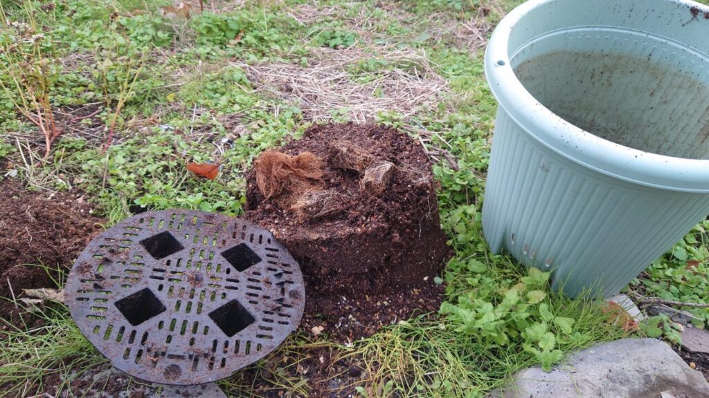 土は再生して使用する方法も考えましたが、労力を考えると新しく培養土を購入似た方が費用も安上がりなので止める事にしました。畑の土が少ない所に撒いておきます。(´・ω・)土再生材より培養土買った方が安い!