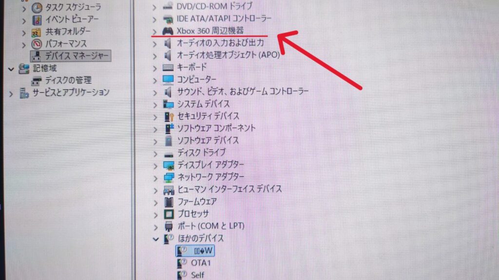 ネットで調べると『XBOX360ワイヤレスレシーバー』のドライバを更新しないと使えないらしい。という事で、コンピューターの管理からデバイスマネージャーを開きXBOX360ワイヤレスレシーバーを探します。