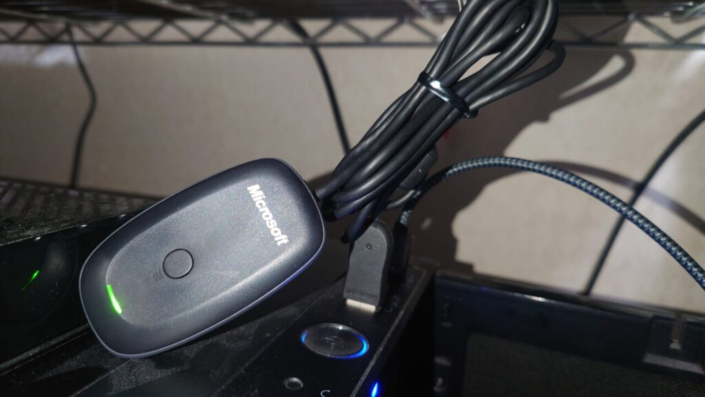 それでは、レシーバーにXBOX360ワイヤレスコントローラーを接続して行きます。かなり昔に新品で購入したXBOX360のコントローラーを押し入れから引っ張り出してきました。(´▽`)懐かしい~