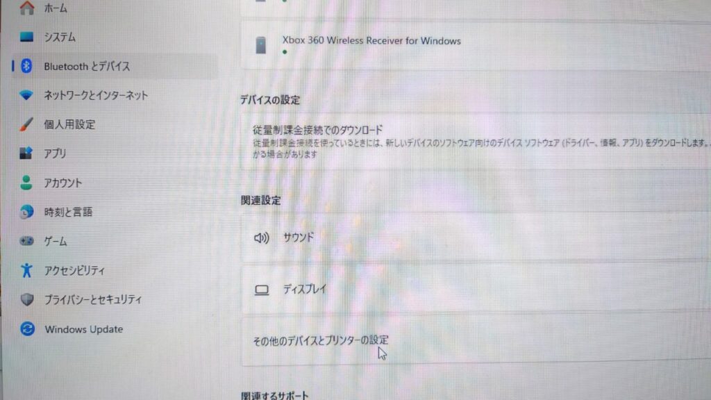 PCのスタートメニューから『設定』→『Bluetoothとデバイス』→『デバイス』→『その他のデバイスとプリンターの設定』に入っていきます。てか、もうレシーバーが認識してますね。(笑)