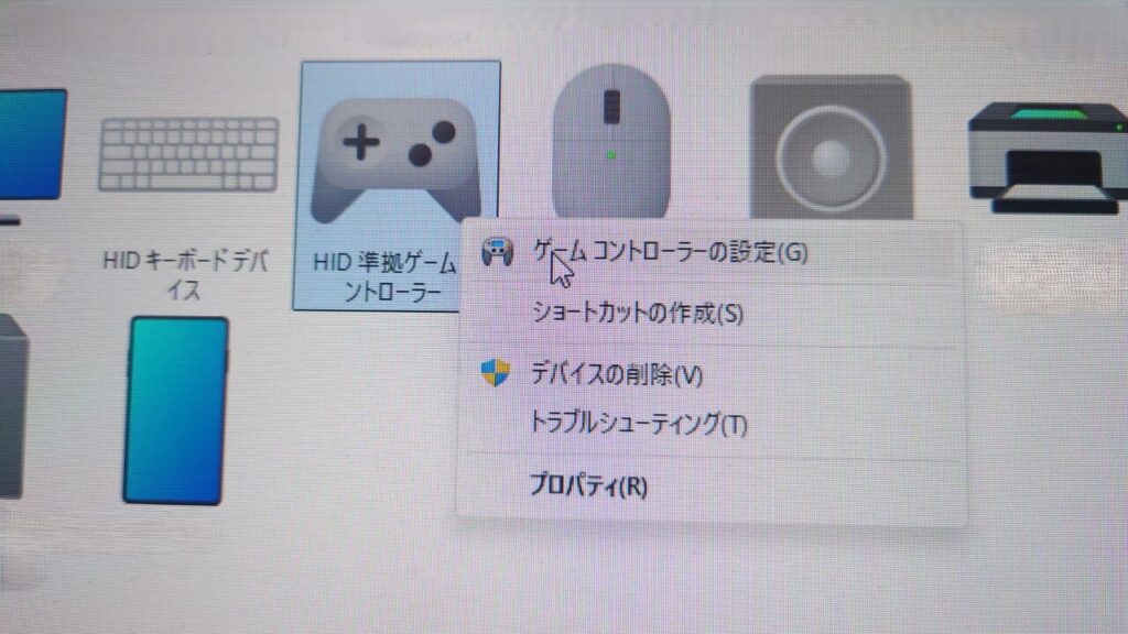すると、デバイス一覧の中にあるHID準拠ゲームコントローラーが接続したXBOX360ワイヤレスコントローラーになるようです。そしたら、マウス右クリックしてゲームコントローラーの設定を選択。