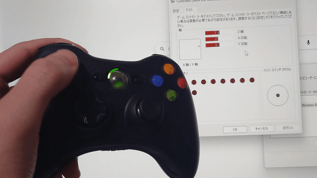 ゲームコントローラーの右下にあるプロパティを選択すると、コントローラー各ボタンの反応を調べる事ができます。今コントローラーは何もしてないので無反応。